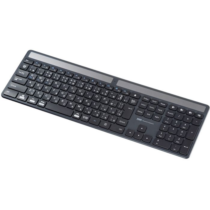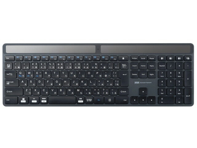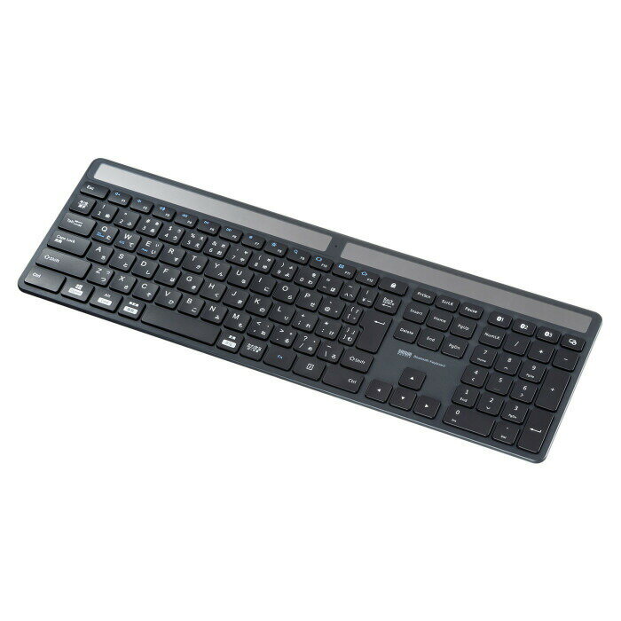部屋の明かりで充電できる電池交換が不要なソーラーパネル内蔵Bluetoothキーボード。■ソーラーパネルを搭載したBluetoothキーボードです。■室内の照明でも充電できるので、電池交換や充電作業は不要です。※充電には200lux以上の明るさが必要です。■蓄電用に電気二重層コンデンサ(スーパーキャパシタ)を使用しています。繰り返し充電に強くリチウムイオン電池に比べ長寿命です。■暗い環境でソーラーパネルに十分な光が当たらない場合でも動作する予備用ボタン電池を内蔵しています。ソーラー充電が完了すると自動的に電源が切り替わる設計です。■環境に配慮した80%再生プラスチックを使用しています。※キーボード筐体の素材に再生プラスチックを採用しています。キートップ及びその他の部品は再生プラスチックではありません。■キーストロークが浅く軽いタッチで入力できるパンタグラフキーを採用しています。■オフィスでも家庭でも使いやすいテンキー内蔵の標準配列です。■剛性が高く、キーの沈み込みが少なく心地よいタイピングが可能です。■マルチOSに対応しています。Windows、Android、macOS、iOSなど様々な機器で使用できます。■最大3台機器を登録でき、ボタンを押すだけで機器の接続を変更できます。