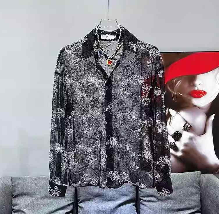 シアーシャツ メンズ 透け感 黒 ブラック 韓国 K-POP 軽量 高級 シースルー 長袖 トップス 春夏 ゆったり セクシー モード ファッション シャツ 羽織り 紳士服 白 薔薇 ローズ