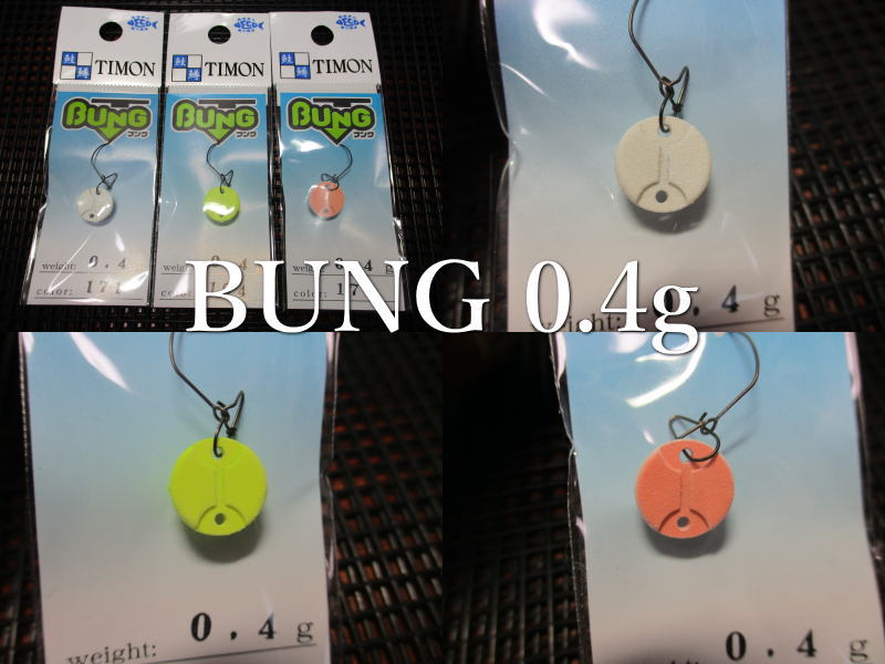 仕様表究極の縦釣りフォールベイトエリアゲームの最終兵器とも言えるフォーリングメソッド“縦釣り”この釣りに特化したTIMONフィールドスタッフの黒野浩二が開発に携わったルアーがこのBUNG(ブング)です。このルアーは樹脂本体に金属製ウェイトを組み合わせた特徴的な構造になっており、「直径が大きく比重の軽い樹脂部分」と「直径が小さい金属ウェイト部分」とのバランスにより、フロントフックポジションでもリアフックポジションでも金属ウェイト側を確実に下にしてパラシュートが落ちるかの如くゆっくりと水平に近い姿勢で揺れずにフォールします。採用したマテリアルは比較的比重が小さく塗装性の良い透明のABS樹脂。そして、むき出しの金属部分は万が一ラインが切れてトラウトが食べてしまっても影響が少ない様、鉛ではなく環境負荷の小さい亜鉛を採用いたしました。形状は前後対象ですのでどちらのアイにフックを掛けて頂いてもOKです。樹脂部分の中央にはフロントフックで使用した際にフックをセンターにキープし易い様に浅めの溝をつけて有ります。基本的な使い方は投げてフォールさせるのくりかえし。その日の状況に応じてフォール時間を長く取ったりボトムに置く時間を長く取ったりしてみて下さい。又、0.4gと0.6gの2ウェイトを準備致しましたので魚の反応に合わせてフォールスピードを調整して下さい。特殊構造による安定したフォール姿勢樹脂と金属の比重が異なる2層構造により、金属ウェイト部が常に下を向いた安定したフォール姿勢を可能とします。また環境を考慮した亜鉛素材を採用。抜群のフッキング率を誇るフックとボディの一体感フロントフックポジションではボディに刻まれた浅い溝がフォール中でもフックをセンターにキープし、ボディとフックが離れづらくなることで、抜群のフッキング率を誇ります。前後アイでフックポジション変更可能フロントフック禁止のエリアもございますので、その際はリアポジションにフックをセットしてください。(※レギュレーションルールに関しましては各エリアにてご確認下さい)魚の反応に合わせる2サイズフォール速度で釣果に大きな差が生じるこの釣り。0.4g・0.6gの2サイズを魚の反応に合わせ選択してください。エリアトラウト 縦釣り BUNGName :BUNGWeight :0.4gLength :10mmHook size :#10Snap size :#0詳細はこちら