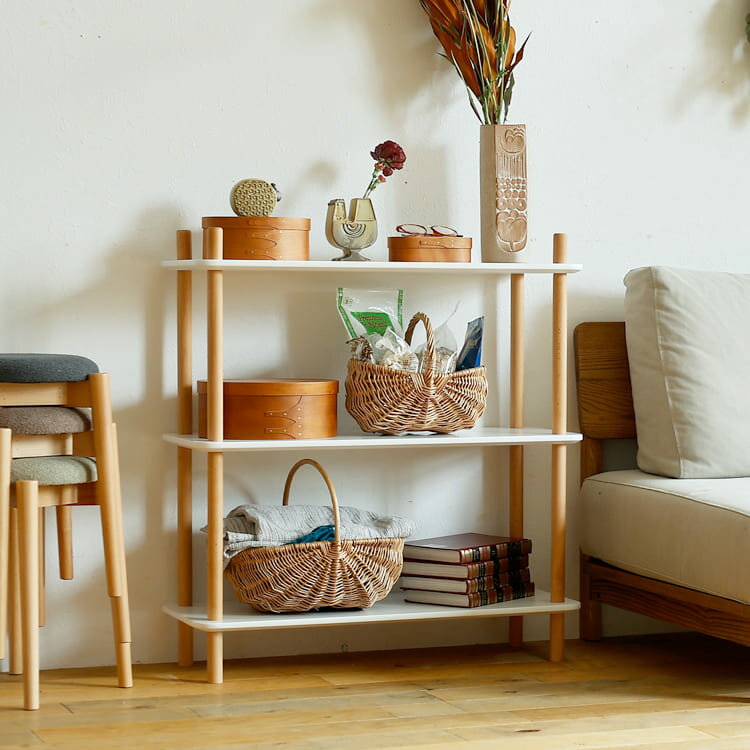 商品詳細天然木ビーチ無垢材を使ったナチュラルフレームとホワイトカラーの棚板の組み合わせが涼しげな印象を感じる3段ラック、barque(バルク)。天然木を使用したフレームにホワイトカラーの棚板をのせたシンプルなデザインとなっていますので、リビングや寝室、キッズルームなどに自然と馴染んでくれるアイテムです。サイズも奥行きが30cmとスリムなサイズ感となっていますので、ご家族でのご使用はもちろんのこと、ワンルームなどの限られたスペースでもお部屋に圧迫感を与えることがなく、おすすめです!barque(バルク)シリーズには、高さの違う3種類がございます。お部屋のレイアウトや収納したいものに合わせてお選びください。サイズ 幅 80cm × 奥行き 30cm × 高さ 85.5cm 梱包サイズ 幅 38cm × 奥行き 88cm × 高さ 17cm 素材 棚板:MDF(化粧繊維板/ウレタン塗装)フレーム:ビーチ無垢材(ウレタン塗装) 重量 商品重量:約11kg梱包重量:約12.4kg 耐荷重 棚板1枚:約10kg 備考 組立品(組立目安時間:お1人で約15分)必要工具:なし付属工具:なし※こちらの商品は天然の木材を使用している為、木目やフシや風合いが画像と異なる場合がございます。 カテゴリーオープンラック/ラック/シェルフ/チェスト/キャビネット/木製/天然木/収納/リビング/寝室/ベッドルーム/ワンルーム/北欧/ホワイト/白/幅80cm天然木ビーチ無垢材を使ったナチュラルフレームとホワイトカラーの棚板の組み合わせが涼しげな印象を感じる3段ラック、barque(バルク)。 天然木を使用したフレームにホワイトカラーの棚板をのせたシンプルなデザインとなっていますので、リビングや寝室、キッズルームなどに自然と馴染んでくれるアイテムです。 サイズも奥行きが30cmとスリムなサイズ感となっていますので、ご家族でのご使用はもちろんのこと、ワンルームなどの限られたスペースでもお部屋に圧迫感を与えることがなく、おすすめです! barque(バルク)シリーズには、高さの違う3種類がございます。お部屋のレイアウトや収納したいものに合わせてお選びください。 こちらのラックは、幅80cm×奥行き30cm×高さ85.5cm。オープンタイプとなっていますので、お気に入りの雑貨やグリーンなどを飾って“見せる収納”として楽しむことができるアイテム。リビングやデスクサイド、キッチンなどお家の色々な場所で活躍しますよ♪ 清潔感を感じるホワイトカラーの棚板は艶やかな光沢を放つ雰囲気が特徴で、リビングのソファでくつろぐティータイムやベッドでのリラックスタイムも、温かみのある雰囲気で包みこんでくれますよ♪陽の光があたったときは程よく反射をし、お部屋を明るく灯してくれるのもポイントですね♪ 棚板間のサイズは共通で、幅80cm×奥行き30cm×高さ32cm。シーンに合わせて様々な目的で使えるオープンラックで、毎日の生活をもっとおしゃれに、快適にしてくれますよ♪ 棚板間の高さは大きいものも収納することができる、32cm。好きな雑貨やアイテムを飾るようにディスプレイするのもおススメですが、カゴなどを使って収納しているものを見せずに収納する方にもピッタリのサイズ感となっています。 ソファーやベッドの横などにあれば便利なラック。お家の中でも長い時間を過ごす場所の近くに置く収納アイテムは、やっぱりお気に入りのアイテムがいいですよね。こちらのオープンラックはフレームに天然木ビーチ材を使うことでナチュラルでかわいらしさも表現。 奥行きも30cmとスリムタイプとなっていますのでリビングやデスクサイドなどの限られたスペースのお部屋に置いても、圧迫感を与えることがなく、おすすめです! 棚板の厚さは安定感のある2cm。 脚部裏には床を傷つけないように、フェルト材が付いています。 天然木ビーチ無垢材の繊細な木目が特徴のフレームとなっています。 床から一番下の棚板までの高さは、10cm。標準的なお掃除ロボットもご使用いただけます。 フロントフォルム サイドフォルム サイズ 幅 80cm × 奥行き 30cm × 高さ 85.5cm 梱包サイズ 幅 38cm × 奥行き 88cm × 高さ 17cm 素材 棚板:MDF(化粧繊維板/ウレタン塗装) フレーム:ビーチ無垢材(ウレタン塗装) 重量 商品重量:約11kg 梱包重量:約12.4kg 耐荷重 棚板1枚:約10kg 備考 組立品(組立目安時間:お1人で約15分) 必要工具:なし 付属工具:なし ※こちらの商品は天然の木材を使用している為、木目やフシや風合いが画像と 異なる場合がございます。