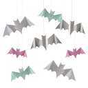 8 Hanging Bats 216892 グリッターで覆われたキラキラ コウモリのハンギングデコレーション 裏はシルバー1色となっています。風で揺れてどちらが見えてもOK 羽の部分には折り目がついているので立体的に見せれます。 サイズ(ミリ)/内容量 大:約292x130/シルバー・ピンク各1 中:約236x105/シルバー・ピンク・グリーン各1 小:約189x83/シルバー・ピンク・グリーン各1 ロープ:約105/8本 商品の特性上、ラメが取れることがありますのでご注意ください。小さなお子様の手の届かいないところに保管してください。