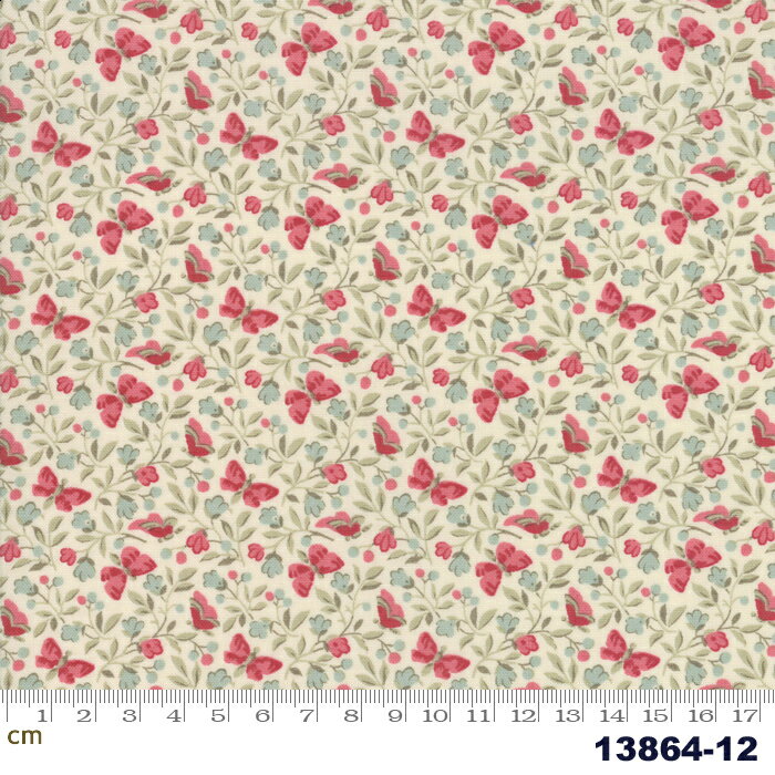 【Moda モダ】Le Beau Papillon-13864-12(2D-01) オフホワイト ブルー系 ピンク系 レッド系 花柄 植物柄 蝶柄 バタフライ アンティーク柄 コットン100% シーチング フレンチジェネラル【10cm単位販売】