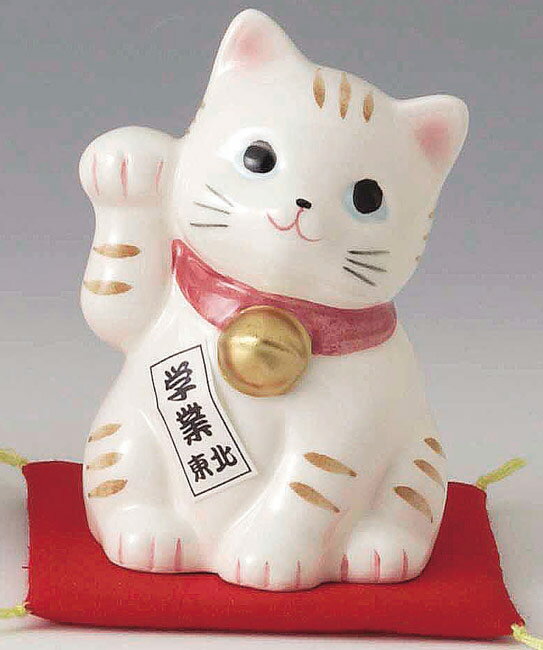 陶器製 豪華赤座布団乗り 風水 東北側置き学業成就招き猫 右手(右前脚)上げ 白色 高さ10cm まねきねこ Feng Shui Beckoning Cat Maneki Neko