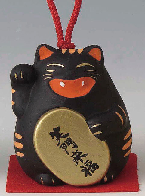 陶器製 福鈴招き猫 左手(左前脚)上げ 黒色 まねきねこ Beckoning Cat Welcoming Cat Lucky Cat Fortune Cat
