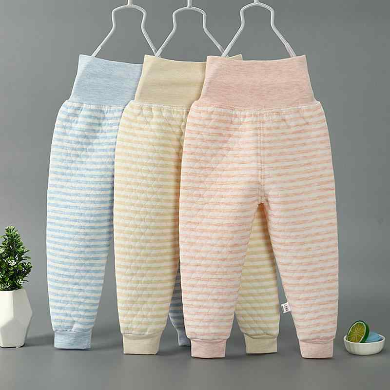 ベビー キッズ 男女兼用 パンツ 秋冬 厚手 裏起毛 あったか 高ウエスト 腹巻付き ロング丈 綿 安心 やわらか カジュアル ストライプ 無地 開閉クロッチ