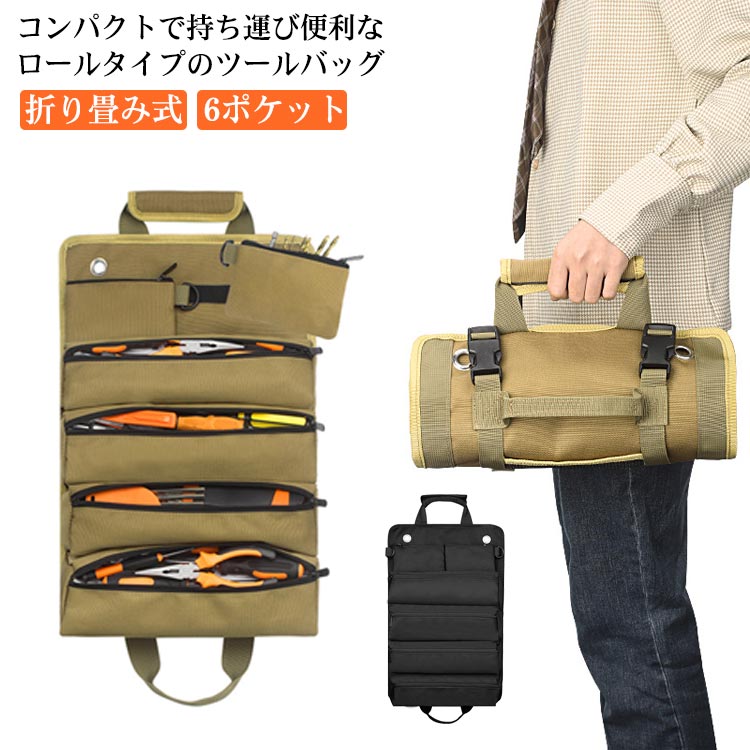 コンパクトで持ち運び便利なロールタイプのツールバッグ。【6ポケット】900D防水オックスフォード生地を採用して、軽量で耐久性があり、耐荷重よい、割れにくい、長い時間でも使えます。ツールバッグの展開サイズは49*32cmで、4つの独立した立体的な差し込みポケットがあり、レンチ、ドライバー、巻尺、ハサミ、ペンチやソケットなど様々なツールをすっきりとコンパクトに収納することが可能です。ツールバッグを巻いて収納でき、持ち運び便利、スペースを節約します。壁&車で掛けられ、外出先で修理が必要な時により便利で早く、ガレージや作業場に持ち運びやすく、掛けることもできます。 サイズFサイズについての説明展開サイズ:32*49cm 巻きサイズ:32*12cm素材900Dオックスフォード 色ベージュ ブラック備考 ●サイズ詳細等の測り方はスタッフ間で統一、徹底はしておりますが、実寸は商品によって若干の誤差(1cm〜3cm )がある場合がございますので、予めご了承ください。●製造ロットにより、細部形状の違いや、同色でも色味に多少の誤差が生じます。●パッケージは改良のため予告なく仕様を変更する場合があります。▼商品の色は、撮影時の光や、お客様のモニターの色具合などにより、実際の商品と異なる場合がございます。あらかじめ、ご了承ください。▼生地の特性上、やや匂いが強く感じられるものもございます。数日のご使用や陰干しなどで気になる匂いはほとんど感じられなくなります。▼同じ商品でも生産時期により形やサイズ、カラーに多少の誤差が生じる場合もございます。▼他店舗でも在庫を共有して販売をしている為、受注後欠品となる場合もございます。予め、ご了承お願い申し上げます。▼出荷前に全て検品を行っておりますが、万が一商品に不具合があった場合は、お問い合わせフォームまたはメールよりご連絡頂けます様お願い申し上げます。速やかに対応致しますのでご安心ください。