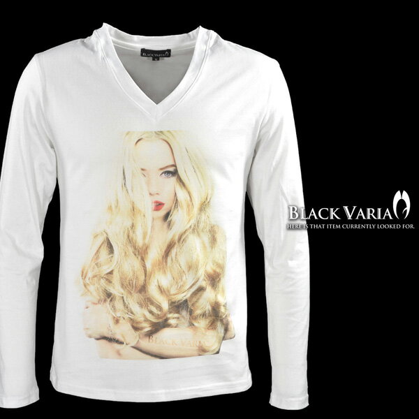 BLACK VARIA ブラックバリア blackvaria Tシャツ ガール セクシー 女性 外国人 外人 Vネック 長袖Tシャツ メンズ スリム 細身 mens ファッション おしゃれ (ホワイト白1) zkt004ls