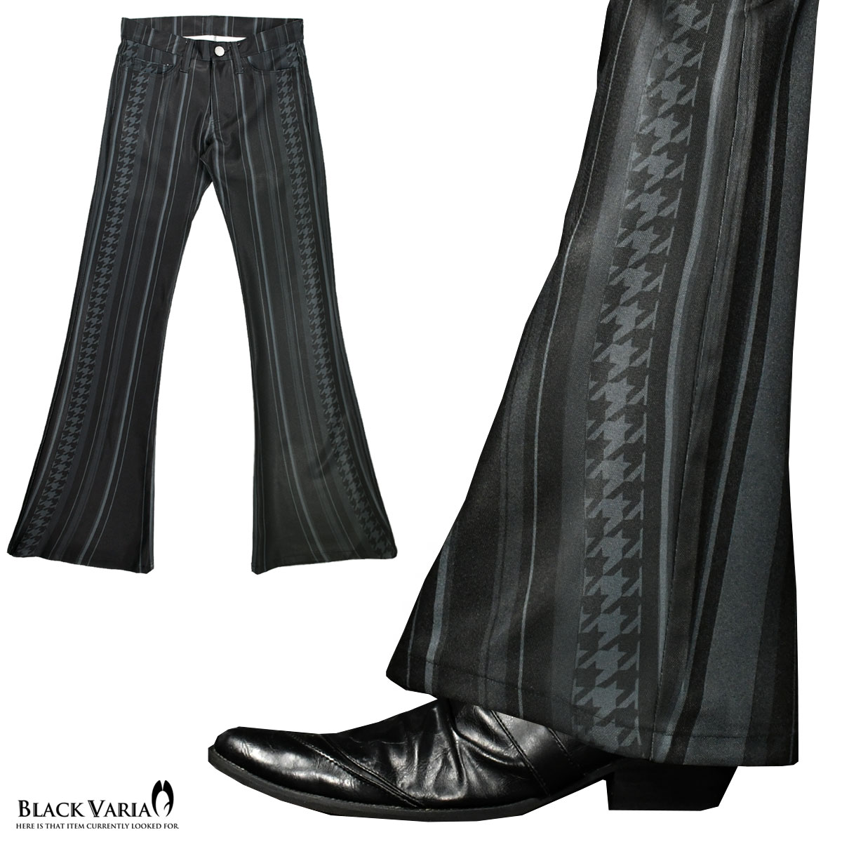 BLACK VARIA ブラックバリア blackvaria ベルボトム ストライプ 千鳥柄 ブーツカット メンズ フレア 日本製 ローライズ ボトムス パンツ ファッション おしゃれ パンタロン(ブラック黒グレー灰) 180092