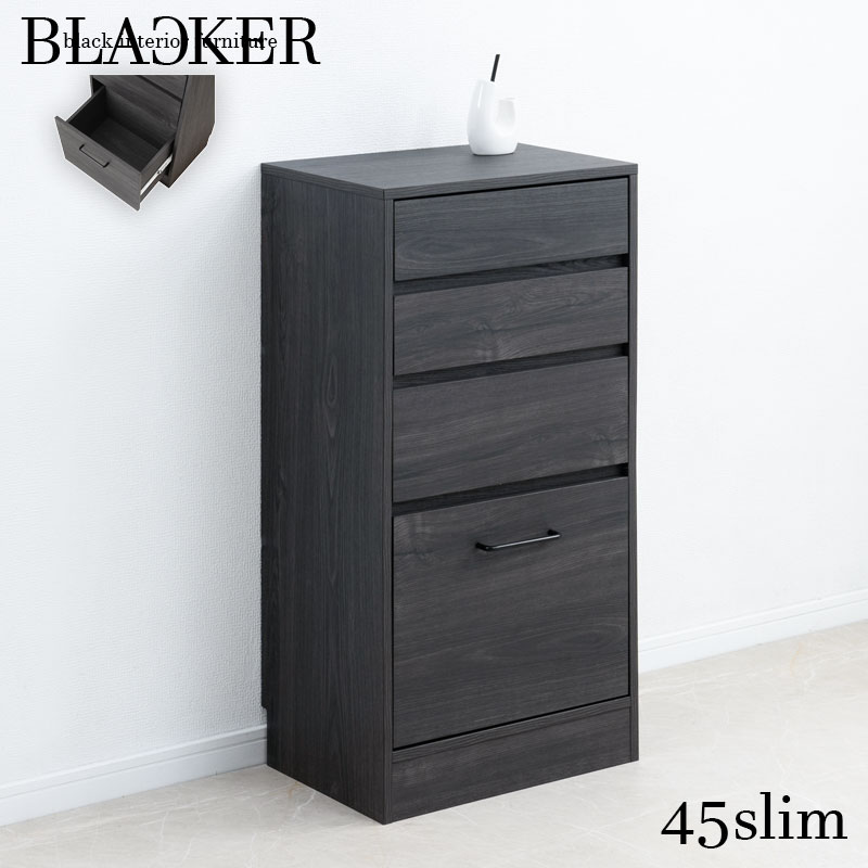 【Blacker LV】スリムチェスト 幅45cm 4段 ブラック 背面化粧仕上げ すきま ラック サイドボード 窓下 引出し 引き出し タンス 隙間 ストッパー付き レール付 ランドリー グレー 黒木目
