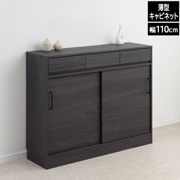 薄型キャビネット 幅110cm 引き戸式扉 Blacker ブラック木目 収納家具 FY-0177LV-NS