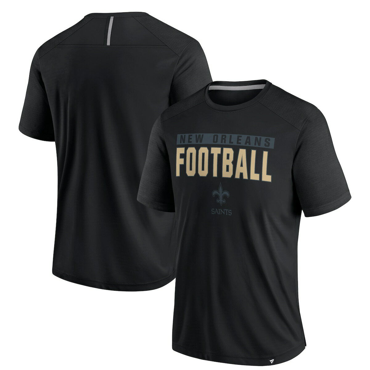 Gear up for game day with this New Orleans Saints Defender Blackout T-Shirt from Fanatics. This 100% polyester tee features perforated raglan sleeves to keep you cool and dry whether you're cheering from the stands or taking to the streets for a Saints victory lap. A screen-printed team name and logo on the front boldly declare your allegiance to the Who Dat Nation.Short sleeveMachine wash, tumble dry lowImportedScreen print team name and logo on frontPerforated raglan sleeves for breathabilityBrand: FanaticsCrew neckOfficially licensedMaterial: 100% Polyester - Body; 92% Polyester/8% Elastane - Mesh