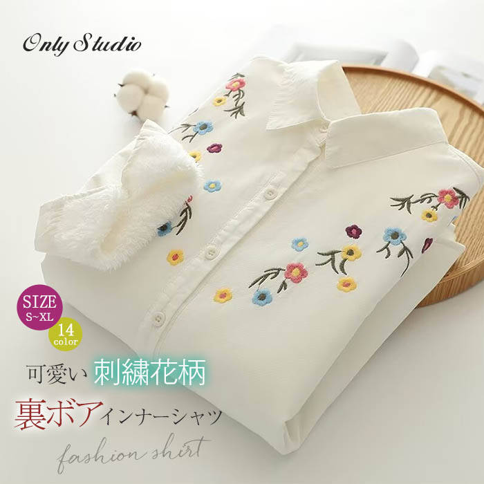 裏ボア シャツ レディース 新作 刺繍 綿 コットン 花柄 うさぎ 猫 風船 長袖 裏起毛 ボア 厚手 ベーシック 折り襟 トップス インナー 前開き 羽織り カジュアル お洒落 防寒 暖かい 大人 可愛い 秋 冬 通勤 OL オフィス ガーリー 20代 30代 40代 50代 着回し 送料無料