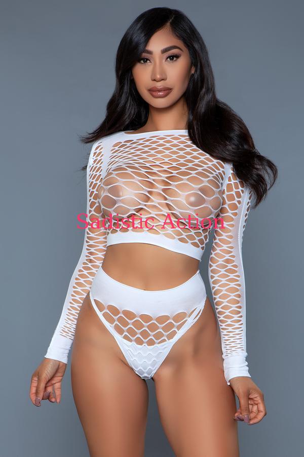 Be Wicked Play With Me Bodystocking ネットボディストッキング2PC SETWHITEロングスリーブトップ、ショーツの2PC SET注)インナーショーツは、付属しません。2 pc longseleeve bodystocking with fishnet crop top and bottom. (Thong not included)USAインポートランジェリー、USAインポートボディストッキング、ポールダンス衣装Be Wicked Play With Me Bodystockingネットボディストッキング2PC SETWHITE