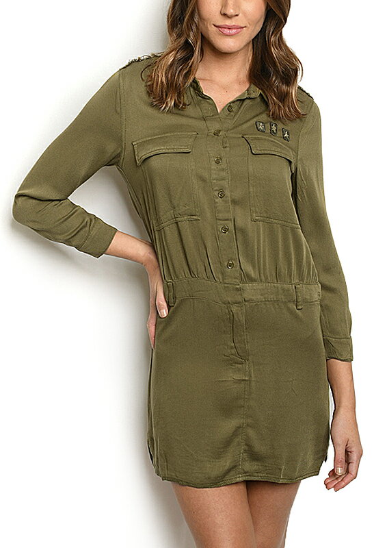 フロントポケット付き長袖ドレス・グリーン ワンピース