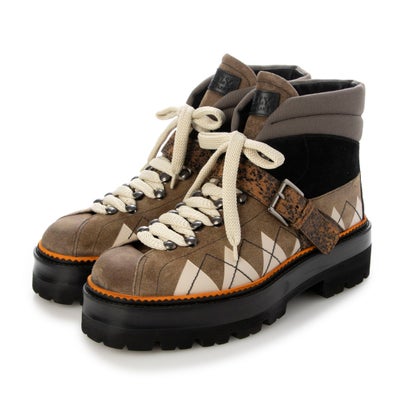 トレンド感と機能性を兼ね備えたミドルカットブーツです。個性的なアーガイル柄が目を引くデザインで、足元におしゃれなアクセントをプラスします。シューレースとサイドベルトの組み合わせが、フィット感を高めるだけでなくスタイリッシュな印象を演出。クッション性のあるソールとしっかりとしたグリップ力で、長時間の歩行でも快適さを保ちます。アウトドアからカジュアルスタイルまで幅広いシーンに活躍するアイテムです。こちらはアウトレット品です。主にはシーズン落ちの新品になりますが、中には細かな傷やシワ、若干の色落ち等がある場合がございます(訳あり品を除く)。7/26cm : 【重さ】638g / 【ヒール寸】5cm / 【プラットフォーム高さ】3.5cm / 【筒丈】13cm / 【筒周り】24cm