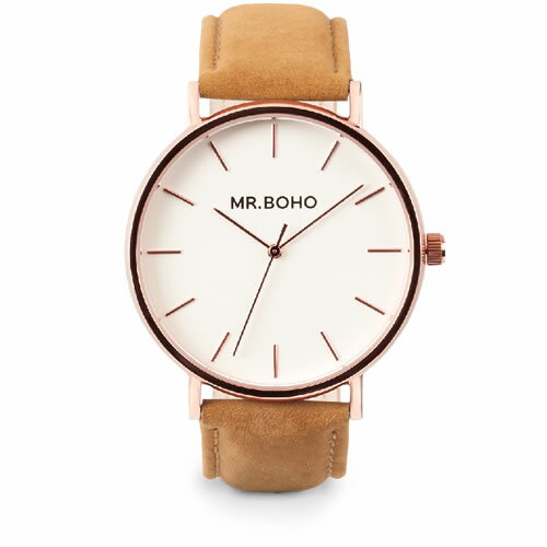 サイズ:ケース40mm、ベルト幅20mm 機能:クオーツ、5気圧防水、レザーベルト 付属品:保証書(購入日から1年間)、専用箱(箱のカラーはアソートとなります。) ※ご購入の際に時計に組み込まれている電池は、時計の機能や性能を確認するための電池(モニター用電池)です。 この電池は、工場出荷時点で組み込まれるため、ご購入時には消耗しています。 そのため、取扱説明書に記載されている「持続時間」より早く電池寿命に達する場合があります。 そのままモニター用電池をご利用いただいても問題ありませんが、早めに電池交換することをお勧めいたします。 ※電池交換については、保証期間内であっても有償となります。ご了承ください。ミラノ製のレザーストラップを採用した高級感あふれるCLASSIC METALLIC STRAP BOVINE LEATHER。 Mr,BOHOが仕上げに徹底的にこだわったステンレスケースはサイドが非常に美しい放物線を描いており、上質な仕上がりになっております。 40mmケースでサイズの少し大きな腕時計をお探しの方には特にお勧めです。 【Mr.BOHO】ミスターボーホー スペイン MR.BOHOは、2013年、<モノヅクリ>に対して熱い情熱と探究心をもった4人の友人がスペインで立ち上げたサングラス&時計のブランドです。若くプロフェッショナル意識の高いクリエイティブなデザインチームが掲げるコンセプトは、シンプルに「高品質なものを、買い求めやすい値段で提供すること。そして、それぞれが個性的であること」。理想のモノヅクリを実現するために、MR.BOHOのコレクションは、シンプル+ベーシック+クラシックなデザインに、デザイナーが探し求める「MR.BOHO」らしさのエッセンスを絶妙なバランスでMIXしています。<本当のあなたを表現できるのは世界中にあなた一人> だから、MR.BOHOは個が埋もれてしまいがちな都会の人々に向けて自分らしくファッションを楽しむアイテムを提案し続け、現在では、腕時計、サングラスの2ジャンルのみでスペインのマドリード、バルセロナの2大都市で100店舗以上、イギリス、ドイツ、フランス、イタリア等ヨーロッパ全土で600店舗以上、世界20ヵ国で展開され現在ヨーロッパで最も勢いがあると言っても過言ではないブランド『Mr,BOHO ミスターボーホー』。オフィシャルでは腕時計はアジアで日本が初上陸となります。