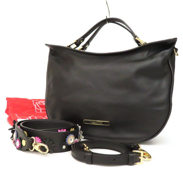 【未使用】BRACCIALINI ブラッチャリーニ ロゴプレート 本革 ソフト レザー ゴールド金具 ジップ 花柄 飾り フラワーストラップ 2WAY トートバッグ ショルダーバッグ 手提げ 肩掛け カバン 鞄 黒 ブラック 保存袋付き イタリア製 レディース