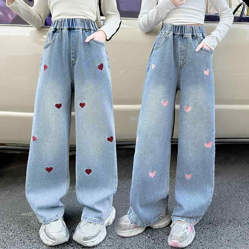デニムパンツ 女の子 女児 ジュニア 小学生 中学生 春秋 カジュアル おしゃれ ハイウエスト ゴムウエスト ハート刺繡 ストレート ワイドシルエット コットン ロングパンツ