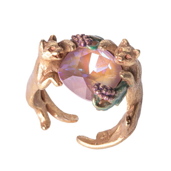 説明気になる植物にじゃれて遊ぶ猫たちのリング。 狙いを定めて果敢に植物に挑む愛らしい姿が注目のポイントです。 角度によって色合いが変わって見える神秘的なカットガラスが印象的なアイテム。 カットガラスの中央のくすみピンクと調和するよう植物をスモーキーカラーで着色し、アンティークな雰囲気に仕上げました。 ※使用しているカットガラスは非常にデリケートな素材です。 強い力や摩擦を何度も加えたり、落下するなどして衝撃があった場合、裏面のコーティング部分に傷が入る恐れがあります。 カットガラスの輝きを損なう原因となりますので、ご使用の際はご注意ください。 また、カットガラス表面にも欠けや傷がつく恐れがありますので強い衝撃を避けてお取り扱いをお願い致します。 ※厚みと幅のあるデザインのため、リングのサイズ調整があまりできない仕様となっています。サイズフリーサイズ(11号ベース)素材真鍮、カットガラス製造国日本製注意事項■こちらの商品はメーカーの職人によってハンドメイドで作られております。そのため、ひとつひとつの塗や表情が微妙に異なる繊細な作りとなっております。 手作りならではの温かみのある表情をお楽しみください。 ■着用後の返品は承りかねますので、ご了承ください。 ■水のかかる場所、湿度の高い場所、直射日光のあたる場所での保管はお避け下さい。変色や変形、錆の原因となります。 ■濡れや汚れが付着したまま放置しないでください。錆、カビの原因となります。強い摩擦によって色落ちすることがございますので、ご使用後は柔らかい布などで軽くふいてください。 ■小さなお子様の手に届かないところへ保管してください。 ■閲覧時のモニター環境によりましては実際の商品と若干違うお色味に映ることもございます。