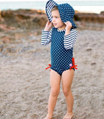 Ruffle Butts ラッフルバッツ 水着 水玉 ネイビー ワンピース 長袖スイムスーツ/3M 6M 12M 18M 2T 3T 4T 5T◆プレゼント・お祝い・キッズ・ベビー子供用・女の子・フリフリ フリル アメリカ インポート ストライプ ラッシュガード UPF 50+◆02P03Dec16