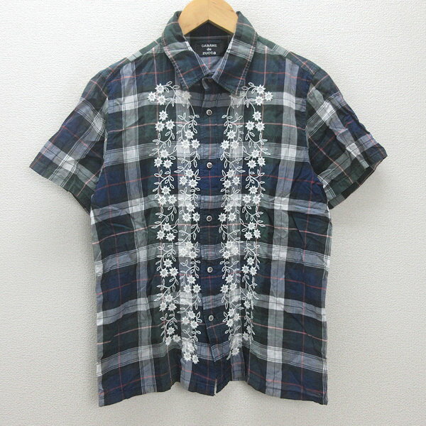 G■ズッカ/CABANE DE ZUCCA 半袖チェックシャツ/花刺繍【M】緑系/men's/149【中古】■