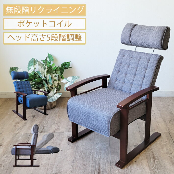 高座椅子 高齢者 リクライニングチェア 肘付き ハイバック 高さ調整機能 ヘッドレスト付 ポケットコイル ファブリック 介護 一人 一人用 チェア パーソナルチェア グレー ブルー 安全 安心 リラックスチェア おしゃれ 和室 シンプル