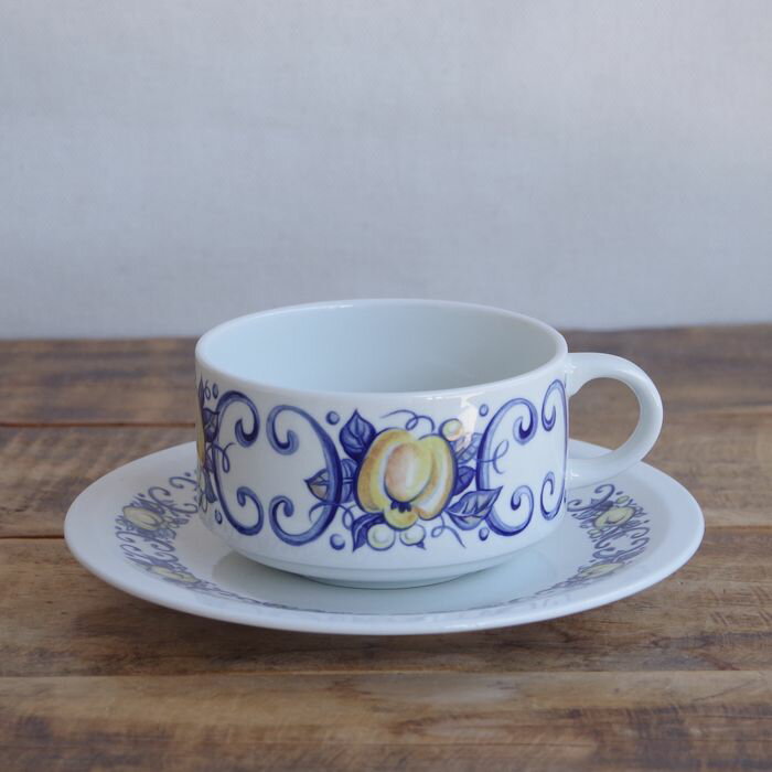 ビレロイ&ボッホのカップ&ソーサーです。 現状ではドイツの陶磁器メーカーですが、 バックスタンプではルクセンブルク製となっています。 Cadiz というシリーズのものです。 ネイビーブルーを基調として、 レモンか梨のようなフルーツの絵柄が はじけるようなタッチで描かれています。 カップはスタッキングしやすいデザインです。 1970~90年代ごろのものと思われます。 状態に関して、特に目立つチップやヒビはありません。 わずかな擦り傷や色剥げはあるかと思いますが、 全体として傷はあまり目につかず、つやがあり、 ヴィンテージ品としては非常にきれいな状態です。 製品本来の品質として、ちょっとした絵柄の乱れや不整形、黒点等はある場合があります。 詳細に関しては、写真をご覧ください。 こちらの商品は複数在庫にございますが、 状態に大きな差がありませんので一商品として販売しております。 写真に写る 4客のうちの 1客をお送りいたします。 ご了承ください。 --- ■カップ:高さ約 5.5cm 口径約 9cm ■ソーサー:直径約 15.3cm ※ 写真に写りこんだデコレーション等はお届け内容に含まれません。 ◆ Boch 商品一覧