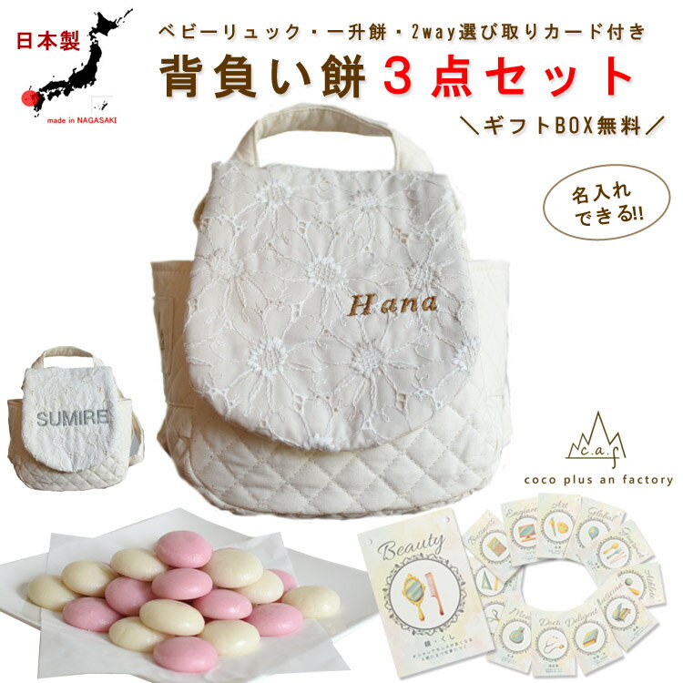 一升餅セット ベビーリュック 選び取りカード 3点セット 背負い餅セット 名入れ レース キルティング 花柄 女の子 男の子 1歳 誕生日 プレゼント お名前 贈り物 赤ちゃん ギフト お祝い 贈答用 紅白餅 紅白もち 小分け 一升米 リュックサック 日本製 caf-0017card3set
