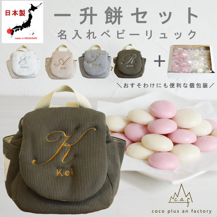 一升餅セット ベビーリュック 一升餅リュック セット 名入れ イニシャル ワッフル 男の子 女の子 1歳 誕生日 ギフト プレゼント お名前 贈り物 赤ちゃん 子供 リュックサック お祝い 出産祝い 一升餅 紅白餅 背負い餅 日本製 送料無料 caf-1021set