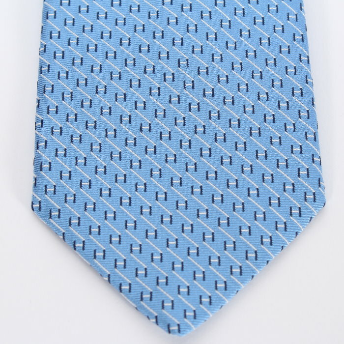 カラー:シェルブルー × ナイトブルー×ホワイト CIEL/BLU NUIT/BLANC サイズ:大剣幅:約8cm 素材:シルク100% 付属品:箱 ・エスカレーターに乗った様にHが斜めに全体にデザインされたネクタイ。 ・フランス製 【注意事項】 折り返して箱に入っているため、折り返し部にシワが有る場合がございます事、予めご了承お願い致します。