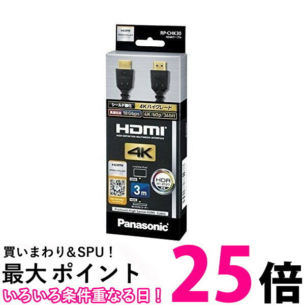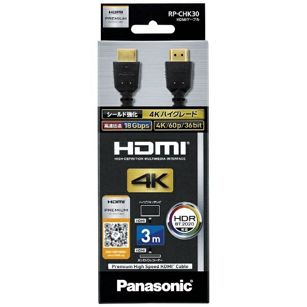 パナソニック RP-CHK30-K 4K60p/18Gbps伝送対応HDMIケーブル 3.0m●4K/60p、18Gbps高速伝送対応のプレミアムHDMI認証済ケーブル4K/60p/4:4:4フルスペック映像の色深度・階調性を忠実に伝えることができます。高画質・高輝度HDR対応、広色域規格BT.2020対応。●ノイズや不要輻射の低減に効果の高い構造を採用ノイズに強い3重シールド強化構造を採用し、接続機器や周辺機器への高周波不要輻射ノイズの影響を低減します。また、亜鉛ダイキャスト製シールドプラグ&ケース採用で、画質音質劣化の原因となるノイズを抑制します。●スペースの狭い機器背面での配線に便利なコンパクトプラグプラグがコンパクトなので、テレビやレコーダーの端子面から約45mmのスペースにコードを収めることができます。【仕様】型式:プレミアムハイスピードHDMIケーブル(PREMIUM HDMI)プラグ:HDMIプラグ(タイプA、19ピン)−HDMIプラグ(タイプA、19ピン)伝送速度:18Gbpsまで対応(4K60p、HDR、BT.2020対応)、ARC(オーディオリターンチャンネル)対応長さ:約3m