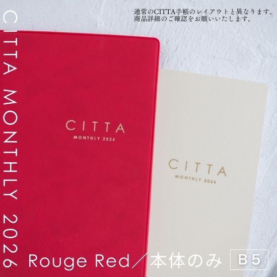 ※こちらの商品は従来のCITTA手帳のレイアウトと異なります。商品内容をご確認くださいませ。 ※こちらの商品にはノベルティは付いておりません。 CITTA MONTHLY 2026(2025年10月始まり)B5 いつものCITTA手帳より一回り大きいB5サイズの「CITTA MONTHLY」継続発売決定! 書きやすい!見やすい!を実現するマンスリーページ&たっぷり方眼ノートの手帳です。 CITTA MONTHLYは 従来のCITTA手帳とはレイアウトが少し違います。 未来を予約する 見通し感のある「2か月見開きマンスリー」と「3年分の年表」。 そして、自由に使える方眼ノートがたっぷり134ページ。 ワクワクリストはありません。ウィークリーページもありません。 だからこそ、自由に使ってほしい。 CITTAの良さはそのままに 自由な発想を存分に楽しんでほしい。 そんな手帳に、なったらいいなと 思っています。 今回は「ルージュレッド」のカバー付きが新登場! 是非、CITTA DIARYとともにご活用くださいませ♪ 商品詳細情報 ルージュレッド/B5サイズ 幅18.7センチ×高さ26.2センチ×厚み1.0センチ 重さ:約400グラム ページ:160ページ 表紙:ルージュレッド 本体のみ/B5サイズ 幅18.2センチ×高さ25.7センチ×厚み0.8センチ 重さ:約337グラム ページ:160ページ 表紙:カバーなし クリーム色 レイアウト 年間表:1年見開き3年分(2026年~2028年) マンスリー:2か月見開き ブロック式(2025年10月~2027年3月) 方眼ページ:134ページ 一粒万倍日、天赦日記載 日本の満月、新月、国民の祝日記載 ※プロジェクトページ、ウィークリーページ、ワクワクリストは付いていません。 製本タイプ 180度フルに開く糸綴じ製本 万年筆でも裏抜けしない上質な紙 ※しおりは付いておりません。 ※祝日は2025年2月1日現在の物です。なお、祝日法などの改正により、祝日・祝日名・休日あるいは行事が変更になる事があります。 改訂について 以下の箇所を改訂しました。 1:マンスリーの曜日:日本語・英語併記 2:フォントを全体的に変更しました。 3:方眼ページが増えました。(70頁から134頁) (※全体のページ:96頁から160頁) 販売価格 CITTA MONTHLY 2026 B5 ルージュレッド:3,190円(税込) CITTA MONTHLY 2026 B5 本体のみ:2,750円(税込) 配送について 商品代金のご入金確認後、日本郵政にて順次発送 ■国内配送料は全国一律550円(税込)、ご購入の商品合計金額3,890円以上で無料です。 ■ゆうパケット 商品2点までのご注文はゆうパケットにて配送いたします。 ※「ゆうパケット」はご自宅のポストへのお届けとなり、配送日時のご指定はできかねます。 ■ゆうパック 3点以上ご注文いただきました商品はゆうパックにて配送いたします。 ・ご注文商品によって弊社で配送方法を選ばせていただきます。 ・土・日・祝日は発送業務休業のため、翌営業日より順次発送いたします。 ・商品を出荷してからお手元に届くまでのお時間は地域により異なります。 お願い ■こちらの商品はお一人様5点までとさせていただきます。 ■数量限定商品となります、フリマサイトへの転売等はご遠慮いただきますよう、ご協力を お願い致します。 ■他商品と合わせて6点以上ご購入のお客様には確認のためご連絡をさせていただくことがございます。 ■注文確定後の商品の変更はいたしかねます。 ■こちらは贈答用に包装ができません。あらかじめご了承くださいませ。 注意点 ■お使いのモニターの発色具合によって 実際のものと色が異なる場合がございます。 ※こちらの商品は従来のCITTA手帳のレイアウトと異なります。商品内容をご確認くださいませ。