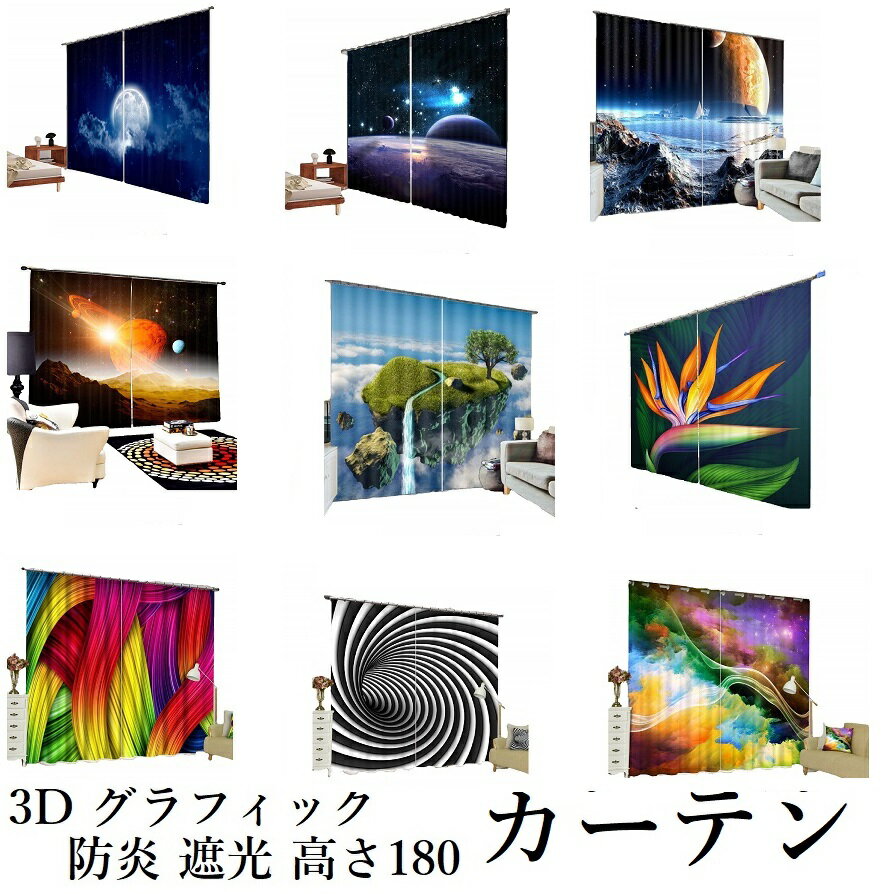 【総柄 防炎プリントカーテン2】神秘的 高品質 3Dグラフィック 宇宙 天空の島 極楽鳥花 銀河 月 森林 110cmX2枚 高さ180cm おしゃれ 防炎 模様替え プリント 宇宙 柄 生地 グッズ