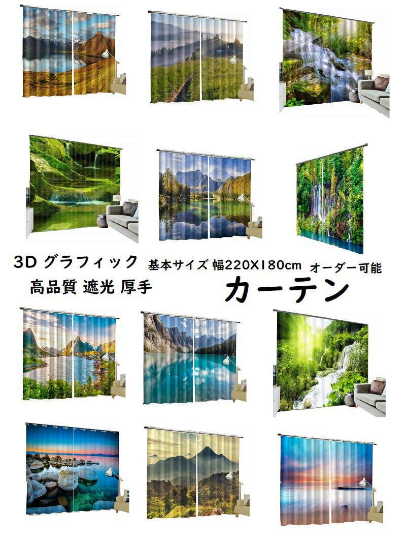 【柄 防炎 遮光 プリント厚手カーテン】自然 山 湖 山河 滝 空 森林 絶景 風景 田園 グラフィック 3D プリント 幅110cmX2枚 高さ180cm おしゃれ 防炎 模様替え プリント オーダーカーテン