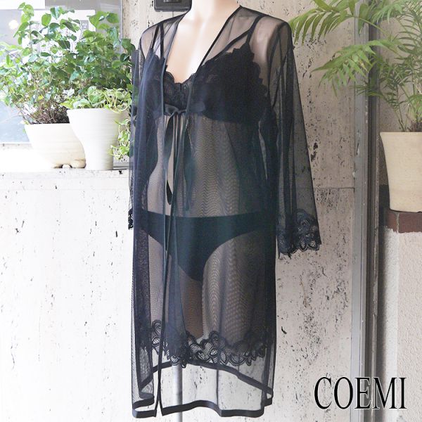 【送料無料】【コエミ(COEMI)】cm181825ポーランド 輸入下着 レディース エレガント セクシー シースルー ブラック リラックス プレゼント 誕生日 クリスマス バレンタイン ガウン 軽い レース付メッシュ7分袖ローブ