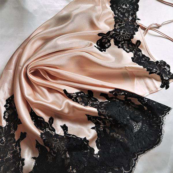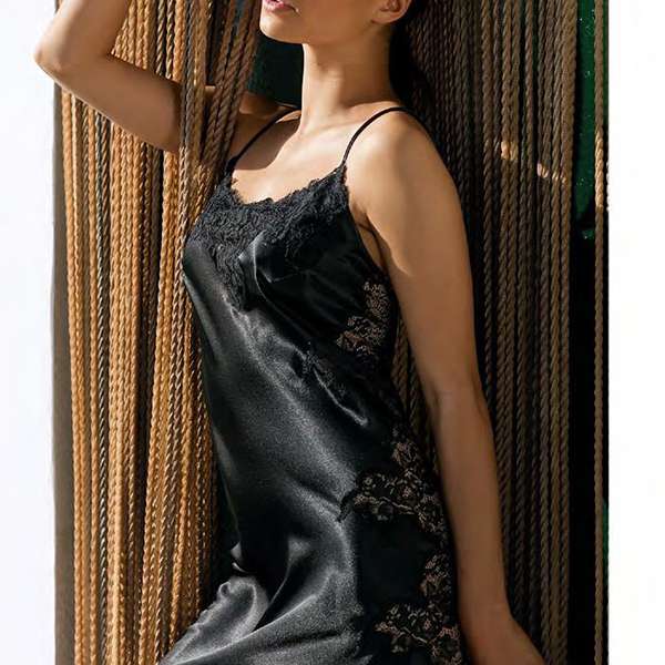 ポーランド製 着丈:90cm 素材:ポリエステル100% サイズ:S(国産Mサイズ目安) カラー:ベージュ/ブラックレース、ブラック/ブラックレース ポリエステルサテンの美しい光沢。エクルベージュとブラックレースを合わせたスリップナイティドレス。 贅沢なレースの使い方は背中のVゾーンにも飾ってリュクス感にあふれている。