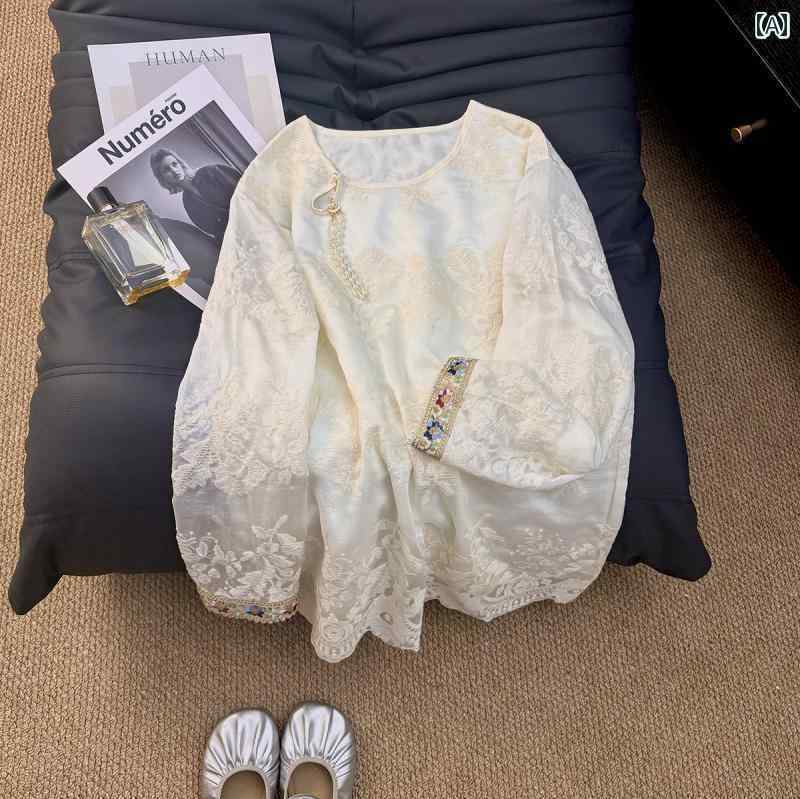 レディース シャツ レース チャイナ風 パールの 重い 刺繍の 白い シャツ レディース 春の 腹を 覆う 底の トップスの アウターウェア かぎ 針 編みの レースの ブラウス