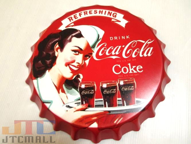 【大迫力35cmボトルキャップ】COCA COLA COKE コカ・コーラ 女 ドリンク ブリキ看板 ボトルキャップ型宣伝 広告 店舗用 アメリカン雑貨 看板