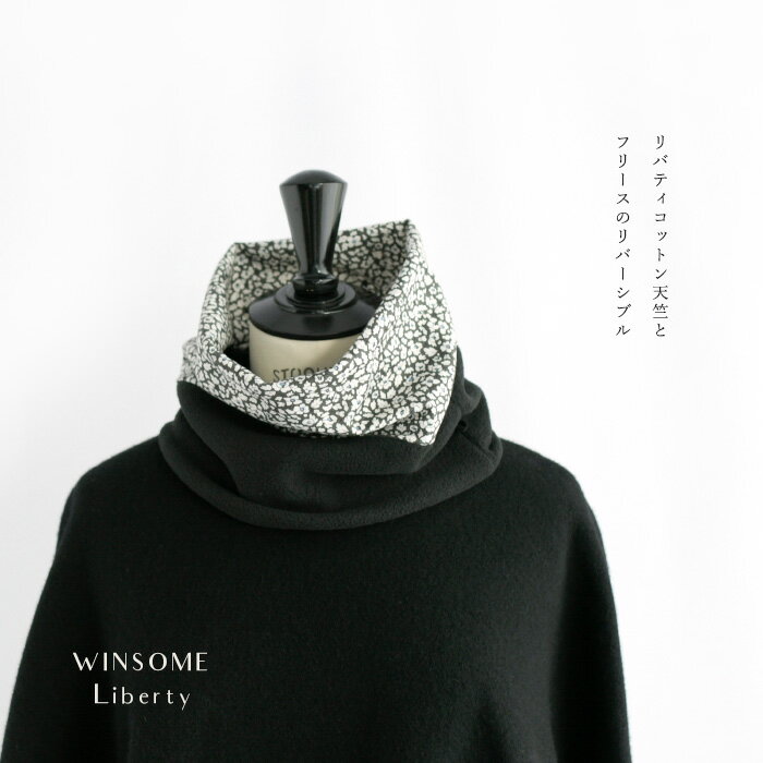 WINSOME Liberty ウィンサムリバティ 【フリースBLACK】× リバティ タナジャージ リバーシブル ネックウォーマー 【選べるリバティ色柄セミオーダー】 32WSL-COLLO-BLK ※メール便は2点まで。3点以上はメール便2個口となります。 フリースとリバティのリバーシブルネックウォーマー リバティのコットン100%のシェラトンジャージ(タナジャージ)と吸湿・発熱機能付きのフリースを使ったリバーシブル使いできるネックウォーマーを作りました。 リバティとフリースのどちらを表側にしても着けられるのはもちろん、上部だけを軽く折り返してみたり、アレンジも楽しめます。リバティのタナジャージは、赤ちゃんの肌着にできるほど柔らかな肌触りのコットン100%のTシャツ素材。横方向に抜群に伸縮するので、頭から被るネックウォーマーの装着時にストレスがなく、また意外と汗ばむ首元は、肌に触れる側がコットン素材なら安心です。フリースの素材は吸湿発熱機能付きの毛玉ができにくいポリエステル100%で、とても滑らかな肌触りです。 この商品はリバティタナジャージの色柄をお選びいただき、あなただけの組み合わせでお仕立てする【セミオーダー】商品です。 フリース色はブラック キメの細やかなフリースだから黒色もしっとりと大人っぽい雰囲気です。 リバティの色柄をお選びください リバティのタナジャージは、赤ちゃんの肌着にできるほど柔らかな肌触りのコットン100%のTシャツ素材。横方向に抜群に伸縮するので、頭から被るネックウォーマーの装着時にストレスがなく、また意外と汗ばむ首元は、肌に触れる側がコットン素材なら安心です。薄手なので洗濯後も乾きが速く、フリースの速乾性と大差なくすぐに乾いてくれるので冬には嬉しい限りです。 ■CAPELカペル|グレー ■SMALL SUS スモールサス スモールスザンナ|ベージュ ■FETHER FIELDS フェザーフィールズ|スカイブルー ■EDNA エドナ|ブルー ■EDNA エドナ|ピンク ■EDNA エドナ|セージグリーン ■FETHER FIELDS フェザーフィールズ|スミクロ ■YOSHIE|ブラック ※黒地に色むらがあるのは製品特性です。 いくつになっても愛嬌のある可愛さを大切にしたい WINSOMEとは「愛らしい・愛嬌のある」という意味。WINSOME Libertyウィンサムリバティはリバティやウィリアムモリスなど伝統の生地を用いて、神戸のアトリエにてハンドメイドで仕立てています。いくつになってもWINSOMEを大切にしたいすべての女性へ、長く時をともにできる心地よいアイテムを提案します。