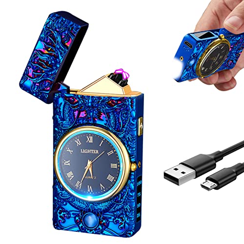 COMANYI 充電式ライター 電子ライター おしゃれプラズマ点火 内蔵LEDクロック&小型ライト USB対応 高耐久金属エンボスデザイン (竜、ブルー)