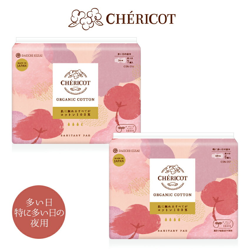 シェリコット CHERICOT オーガニック コットン ナプキン 羽つき 羽なし 多い日の夜用 CON-016 CON-017 オーガニック100% 日本製 国産 高品質 生理用品 生理用ナプキン サニタリーパッド 敏感肌 冷え性