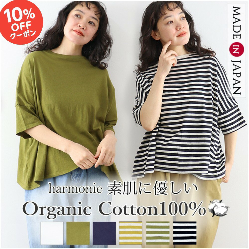 21日限定10%OFFクーポン&P最大47倍/オーガニックコットン ボーダー Tシャツ レディース 5分袖 カットソー 綿100 ボートネック ゆったり 大きめ プルオーバー 綿 かわいいharmonie Organic Cotton アルモニ甘編み 天竺 綿100% ボーダートップス 日本製 82540675
