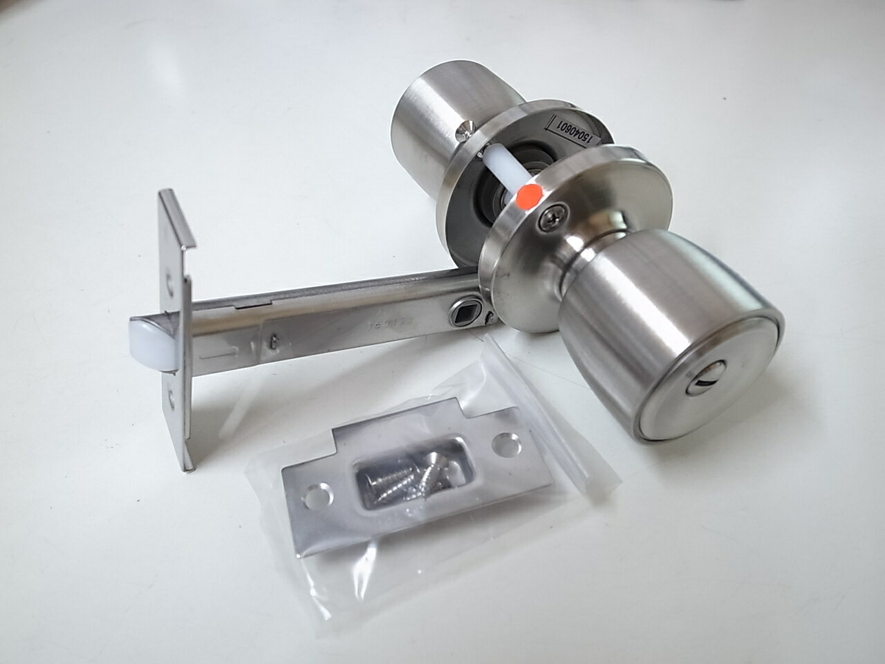 HINAKA(ヒナカ)社のCOW(カウ)ロック261シリーズの間仕切錠(片面非常開錠、片面サムターン)タイプです。バックセット90ミリ、扉の端のステンレスのプレートサイズはタテ80ミリ、ヨコ26ミリ、ビスピッチ41ミリ(ロングフロント)です(フロント刻印261 COW)。両方の握り玉は6.5ミリ角の軸芯でつなげられてます。
