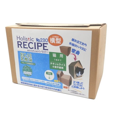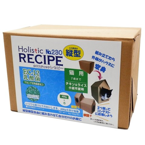 2.4kgは外箱を組み立てることでネコちゃんのハウスとしてご利用いただけます。 また、複数の外箱を組み合わせることで自分だけのお家を作ることも可能となっております。 商品説明 フード100gあたり、1100億個以上の乳酸菌配合 ホリスティックレセピーは、愛猫が毎日健康で元気に過ごすために必要な成分は勿論、泌尿器系障害や毛玉・整腸・抗酸化作用・免疫力・便臭・皮膚・被毛などを多角的に考えて作られています。 ホリスティックレセピーは、愛猫の健康維持にバランスのとれた栄養を与えられるというAAFCO(米国飼料検査官協会)の必要栄養所要量の基準を満たしています。 尿結石に配慮: マグネシウムを制限しています 毛玉(ヘアーボール)に配慮: 異なる繊維質を豊富に配合することで毛玉(ヘアボール)に配慮しています 免疫力維持: 毎日与える食事だからこそ合成保存料・合成着色料・人工香料を使用せず、バランスのとれた栄養を摂ることで健康を維持し本来持っている免疫力を保ちます おなかの健康維持: 醸造酵母と消化吸収速度の違う数種類の炭水化物を使用することにより、腸内でゆるやかに吸収され胃腸の健康を保ちます 皮膚・毛艶: 原材料のひまわり油には摂取しにくいオメガ3脂肪酸多く含まれています。このオメガ3脂肪酸が皮膚と毛艶を健康に保ちます キレート化ミネラル: 単体では吸収しにくいミネラルを、アミノ酸で包み込むことでミネラルの吸収性を高めています 原材料: 鶏肉、鶏肉粉、米、豆粉、鶏脂、乾燥卵製品、豆タンパク、ポテトタンパク、ツナミール、ナチュラルフレーバー、酵母エキス、ひまわり油、アルファルファミール、ビートパルプ、オーツ麦繊維、トマト粗、醸造酵母、亜麻仁、クランベリーパウダー、チコリエキス、ユッカフォーム抽出物、アカシア食物繊維、乳酸菌末(殺菌乳酸菌、デキストリン)、塩化カリウム、塩化ナトリウム、リン酸、DL-メチオニン、タウリン、アスコルビン酸、イノシトール、塩化コリン、ミネラル類(アミノ酸キレート化鉄、アミノ酸キレート化亜鉛、アミノ酸キレート化銅、アミノ酸キレート化マンガン、アミノ酸キレート化コバルト、鉄、亜鉛、炭酸カルシウム、銅、マンガン、セレン、ヨウ素、コバルト)、ビタミン類(A、D3、E、ナイアシン、パントテン酸、B1、B2、B6、葉酸、ビオチン、B12)、サッカロマイセス・セレビシエ、ラクトバチルス・アシドフィルス、エンテロコッカスフェシウム、アスペルギルス・ニガー、バチルス・サブチルス、酸化防止剤(ミックストコフェロール、クエン酸、ローズマリーエキス) 成分: たんぱく質:32.0%以上 脂質:19.0%以上 粗繊維:5.00%以下 粗灰分:8.00%以下 水分:10.00%以下 マグネシウム:0.10%以下 カルシウム:1.00%以上 リン:0.80%以上 タウリン:0.18以上 代謝エネルギー:365kcal/100g 原産国: 米国 発売元: 株式会社パーパス