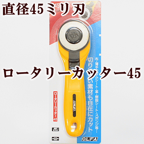 ★ 3,980円以上ご注文で、宅配便・ゆうパケット 送料無料 ★【1】日本郵便 ゆうパケット(メール便) 全国一律 280円■ポストへのお届け(盗難、未投函などの補償なし。日時指定不可。)■厚み3cm、3辺合計60cm以内まで★規定サイズ内に収めるコツ★商品名上に記載の 「#ゆうパケ○点可」 の数字をご参考に、上手にお買い物なさってください。※同一商品を注文した場合、何点まで入るかの目安の数字となります。【下記の場合、宅配便に変更させていただきます↓】・規定サイズを超える場合★同時に送料も変更させていただきます。■「ゆうパケット送料無料」と記載のある商品で、送料無料希望の方はゆうパケットをご選択ください。ただし、「ゆうパケット送料無料」商品をご注文でも、宅配便希望の場合は、宅配便をご選択ください(送料の差額が発生します)。------------------------【2】日本郵便 ゆうパック(宅配便) 全国一律 650円日時指定OK!■3,980円以上のお買い上げでも、配送方法「ゆうパケット」希望にチェックがある場合は、ゆうパケットでのお届けとなります。【ゆうパケット・ゆうパック共通注意事項】※ご注文後に、複数通に分けてのご発送はできかねます。■ロット(生産時期)が異なると、同じ品番のものでもカラー、サイズ、品質が変わります。同じ種類、材料、染料を用いても製造過程において完璧に同じものを再現することが難しく、このような現象はどの商品にも見られます。 詳しくはこちら→前回とは色や幅が異なるという理由での、返品交換はお断りをしていますのでご理解ください。■領収書、明細書は同封しておりません。(エコ、個人情報保護、配送のスピード化などの理由によるため)【1】領収書商品発送後、購入履歴画面の「領収書を発行する」ボタンからPDFで発行できます。(※後払い決済を除く)▼下記の場合は、領収書の発行は出来ません。【後払い決済】運収納印のある払込受領書が公的な領収書となります。【クレジット】お客様ご契約のクレジット会社が発行するご利用明細書が代わりとなります。【コンビニ決済】払込受領証が領収書となります。【全額ポイント支払い】ご請求金額が0円のため発行できません。------------------------【1】明細書▼明細書をお入れしておりません。・「ご注文確定メール」が明細書の代わりとなります。・楽天会員様はご購入履歴からもご確認いただけます。------------------------当店からのメールを必ず受信していただきますよう、「ドメイン指定受信解除」していただきますようお願いいたします。(my-mama@d5.dion.ne.jp と、 auc-my-mama@shop.rakuten.co.jp)【1】商品のカットに関しまして・生地、ブレード、ゴム等、長さを指定してのカットのご依頼はお受けできかねます。(例:1Mを5枚に分けて、1M・2Mを1枚ずつ、など)・カット販売の商品に関しましては、ご注文いただいた数量をつながった状態でお届け致します。(ご注文数が多い場合は途中でカットしたものをお届けする場合がございます。)高い品質と実績のOLFAロータリーカッター45円形刃を回転させて布や紙を切るカッターで、布逃げしやすい薄地やバイアス、曲線など自在にカットできます。布や紙に使用でき、シルクなどの薄手のものから、キルティングなどの厚手のものまで、幅広くご利用頂けます。右利き・左利きどちらもお使い頂けます。使用後はブレードカバーを使って安全に収納できます。【商品詳細表】 ■商品番号234B■サイズ直径 45mm刃パッケージ:約W80×H220×D20mm ■内容量1個 ■ゆうパケット6点まで可 ゆうパケット送料無料■注意事項・刃物ですから取扱いにご注意下さい。・幼児の手の届かないところに保管して下さい。・繊細な商品のため、カッターボードの小さなキズや小さなゴミなどの上でカッターを使用されますと刃こぼれの原因等に繋がる場合がございますのでご注意下さい。・下敷きにはカッティングマットをお使いください。・刃の部分には、錆止めのオイルが塗布されています。オイルが目立つ場合は、手を切らないよう気をつけて布やティッシュ等でお拭き取りください。・ご使用の際はパッケージに記載されている注意事項を、よく読んでご利用下さい。上記ご了承の上、お買い求めいただきますようお願い申し上げます。■おすすめ その他の手芸道具はこちら↓替刃を見る↓替え刃 45mm 1枚入替え刃 45mm 10枚入↓ サイズ違いもオススメ ↓OLFA ロータリーカッター28OLFA 替刃 S 28mm↓ こちらもオススメ ↓曲尺 定規 30cm×15cmカッティングマットA3サイズ 約30×45cmMYmamaオリジナルロータリーカッターその他の手芸道具はこちらからゆうパケット制限に関して【クリック】