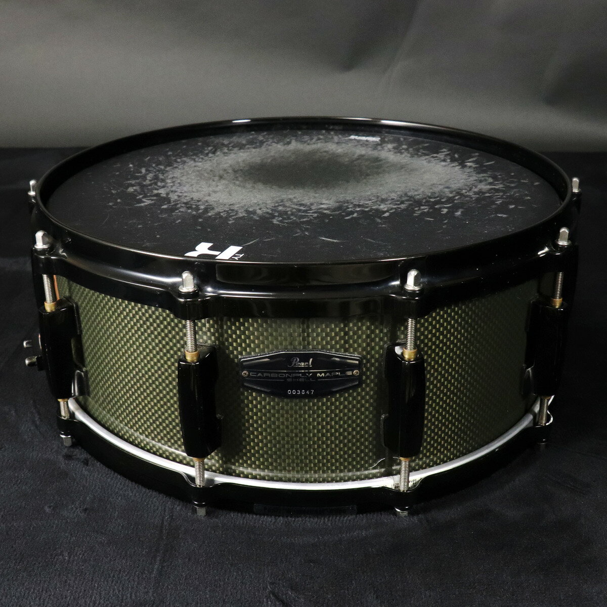 薄めの6ply(5.4mm)メイプルシェルの内外にカーボンクロスをラミネートした、パールオリジナルのハイブリッド・スネアドラムカーボン素材を採用したハイブリッド・シェルのスネアドラム。等厚6プライ・メイプルシェル(5.4mm)の内外にカーボンクロスをラミネートした浅胴(深さ5.5")サイズの“カーボンプライメイプル”は、エッジの効いた図太い鳴り、鮮やかな音の輪郭とシャープなサウンドで、ライブからレコーディングまで、そのポテンシャルをいかんなく発揮します。ヘッドなどは現状です。簡易クリーニングのみ実施しております。スナッピーが42本タイプに交換されています。傷やパーツの錆やビッツなど使用感はございますが、問題なく使用できる状態です。商品ランク: B+:多少傷はあるが通常使用する用途において問題なしシリアルナンバー: 003647ケース: ソフトケース