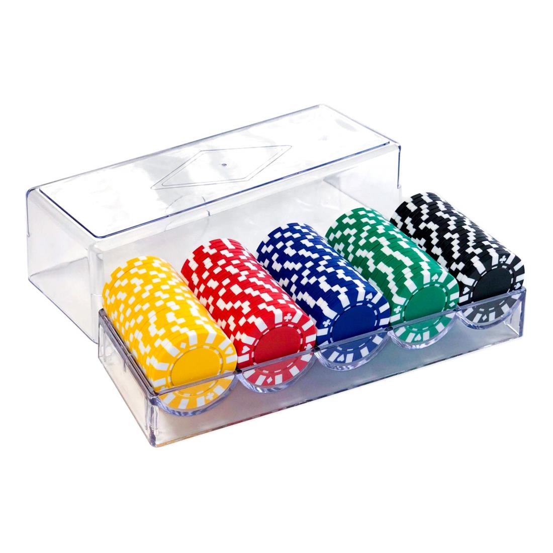【ヨロズラボ】 ポーカーチップ 100枚セット プロ仕様 5色(各色20枚、計100枚セット)専用アクリルケース付 麻雀 ポーカー カジノ ルーレット バカラ ブラックジャックケースサイズ : 約 W 210 × D 80 × H 60 mmチップサイズは約:直径40mm×厚さ3.4mm、重さ12g (各色20枚 ブラック、レッド、イエロー、グリーン、ブルー)デザインはスペード・ハート・クローバー・ダイヤのマークが周囲に添えてあります。実際のカジノでも使用されている高級感のあるモデルになります。ポイントをプリントしていないため、様々なゲームでご利用いただけます。