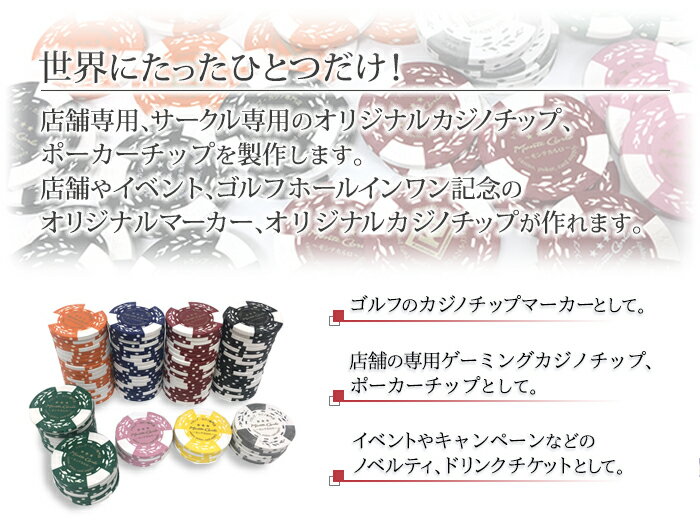 ◆ 仕様 ◆ ・カジノチップ材質:クレイ(粘土) ・重量:9g(1枚あたり) ・チップカラー:全9色(白、赤、黒、緑、青、橙、桃、黄、紫) ・インク:金色、または銀色 ・刻印、印字方法:箔押し、又はシルク印刷・パット印刷 ◆ 料金 ◆ 1)デザイン・型代:32,000円(税抜) +追加デザイン2点以降(表裏別等)14,000円(税抜) 2)チップ代:@250円(税抜) 100〜300枚未満 @270円 300枚以上〜500枚未満 @250円 500枚以上〜1000枚未満 @220円 1000枚以上〜 @200円 2000枚以上〜 @180円 3)包装費用、発送代: 2800円(税抜) ※ご注文最少数量は100枚〜 追加100枚単位。 ※チップカラーは製造枚数に関係なく、自由にご指定頂くことが可能です。 (例)100枚のチップをご注文し、デザインは共通、赤10枚、青30枚、黒15枚、白45枚 計100枚。 ★ 価格についてのご注意 ★ 価格はデザイン数、枚数により下記のように異なるため、まずは一番少ない仕様(デザイン表面のみで100枚)の上記価格(57,240円)でご注文ください。 ご注文後、あらためてメールにて弊社よりデザインや枚数等についてお伺いの上、お見積もりを作成いたします。 ※ご不明な点は、メール、電話などでお気軽にお問い合わせください。 ◆ 納期 ◆ 14日後、納品。 ※ご注文後、ご入金とともにデザイン、製作サンプル図の最終チェックをして頂き、製作開始OKを頂いた後14日後に製造完了、お届けとさせて頂きます。 ※600枚以上のご用命についての納期は、個別ご相談とさせていただきます(30日程度) ◆ ご注文の流れ ◆ 【step1】WEBからご注文手続 こちらのページよりチップ数量 デザイン数を選んでご注文データを確定させてください。 自動送信で「ご注文確認メール」が届きます。 ご希望のデザイン、絵柄をお持ちの方は、ご注文確認メールに返信にて、データファイルを送付ください。デザインファイルは、イラストレータデータ、jpeg, jpg データがおすすめです。 【step2】電話打ち合わせ後、受注確定メールを送信 【step3】代金のご入金 【step4】デザイン校正後、製作イメージを送信。 【step5】お客様の最終チェックOKを頂き、製造開始 【step6】(14日後)商品完成→ 宅配便でお届けします。 <商品詳細> ・商品名:オーダメイド・オリジナルカジノチップ・ポーカーチップ製作 【オリジナルメダル、オリジナルゴルフマーカー、マーカー、ノベルティ】 ・内容物:オリジナルチップ(最少単位100枚〜)、チップラック付。 ・材質 :クレイ(粘土質) ・チップカラー:全9色(白、赤、黒、緑、青、橙、桃、黄、紫) ・刻印、印字方法:箔押し、シルク印刷、パット印刷等。 ※チップカラーは製造枚数に関係なく、自由にご指定頂くことが可能です。 (例)100枚のチップをご注文し、デザインは共通、赤10枚、青30枚、黒15枚、白45枚 計100枚。 用途: アミューズメントカジノゲーム施設、ポーカーカフェ、ゴルフマーカー、飲食店様ドリンクチケット等。 【注意】 一部のカラーに製作材料の在庫切れが発生しています。場合によって、代替チップにて対応させていただくため、チップ周囲のデザイン、仕様が変更になる場合がございます。 最強の自由度 ! お好きな 文字 で 作れる オリジナル マーカー ! ゴルフマーカー 名入れ カジノチップ マーカー オリジナル マーカー 作成 名入れ カジノ ゴルフ マーカー 名入れ おもしろ ゴルフマーカー コンペ 記念品 コンペ景品 参加賞 ゴルフ マーカー 写真入り プレゼント 名入れギフト 数量割引あり【オリジナルメダル、オリジナルゴルフマーカー、マーカー、ノベルティ】 カジノ ゴルフマーカー 名入れ おもしろ ゴルフマーカー コンペ 記念品 コンペ景品 参加賞 ゴルフ マーカー プレゼント 名入れギフト 最強の自由度 ! お好きな 文字 で 作れる オリジナル マーカー ! ゴルフマーカー 名入れ カジノチップ マーカー オリジナル マーカー 作成 名入れ カジノ ゴルフ マーカー 名入れ おもしろ ゴルフマーカー コンペ 記念品 コンペ景品 参加賞 ゴルフ マーカー 写真入り プレゼント 名入れギフト 数量割引あり