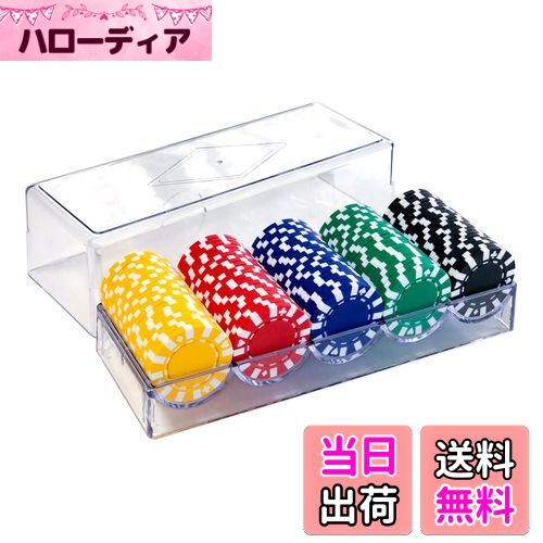 【ヨロズラボ】 ポーカーチップ 100枚セット プロ仕様 5色(各色20枚、計100枚セット)専用アクリルケース付 麻雀 ポーカー カジノ ルーレット バカラ ブラックジャックケースサイズ : 約 W 210 × D 80 × H 60 mmチップサイズは約:直径40mm×厚さ3.4mm、重さ12g (各色20枚 ブラック、レッド、イエロー、グリーン、ブルー)デザインはスペード・ハート・クローバー・ダイヤのマークが周囲に添えてあります。実際のカジノでも使用されている高級感のあるモデルになります。ポイントをプリントしていないため、様々なゲームでご利用いただけます。