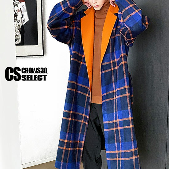 チェックコート メンズ モード系 メンズ ロングコート ロング丈 ガウンコート 変形 バイカラーコート インポート 送料無料 2020 秋 冬 新作 お兄系 ホスト アウター 個性的 スタイル ブルー 青 オレンジ ホスト スーツ ヴィジュアル系 ファッション ストリート系 メンズ